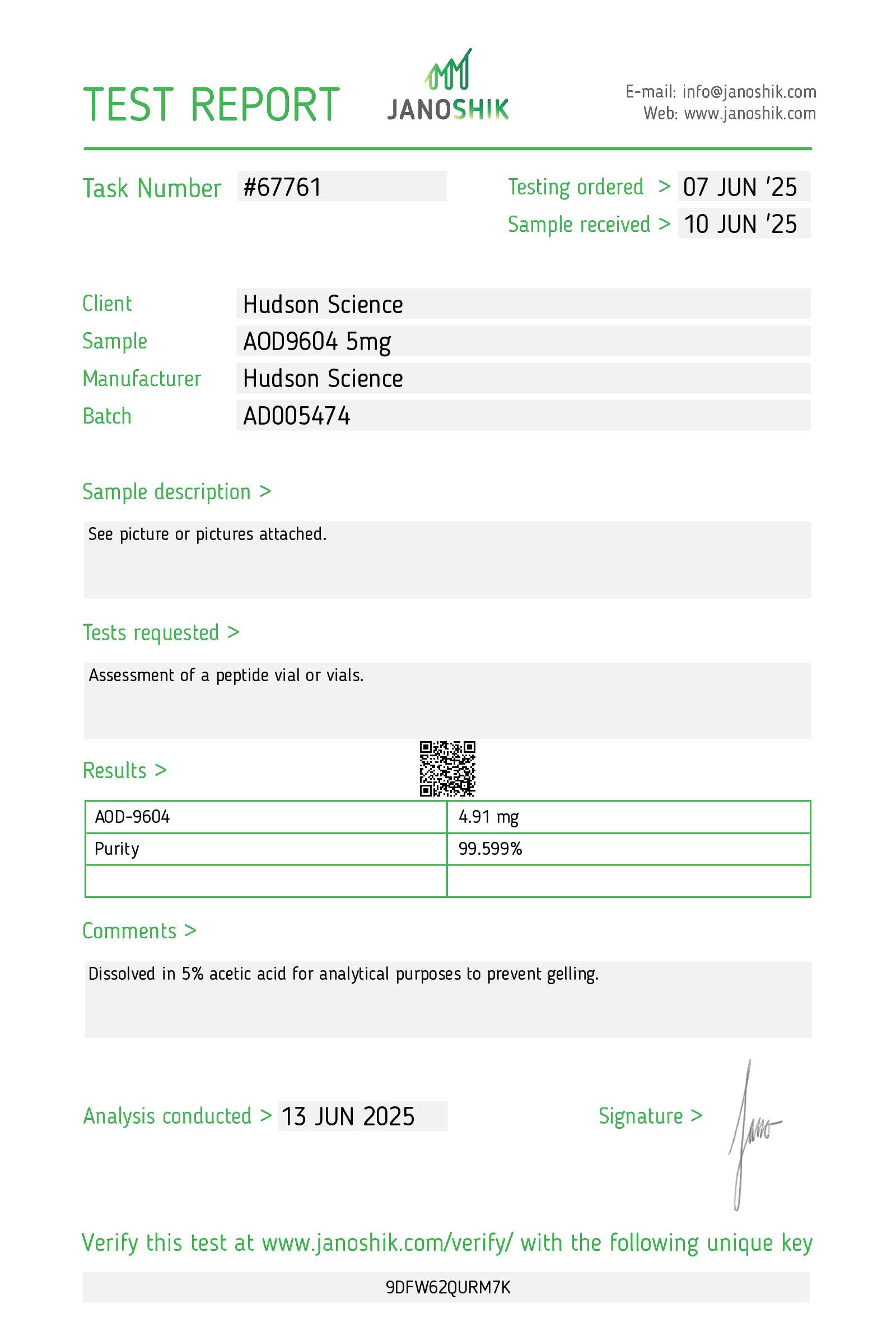 ![AOD9604 5mg + ACETIC ACID WATER [Targeted fat breakdown] - Hudson Science (Certificate of Analysis, Second Image) - Image 3](https://truenorthperformance.is/wp-content/uploads/2025/05/AOD9604.png)