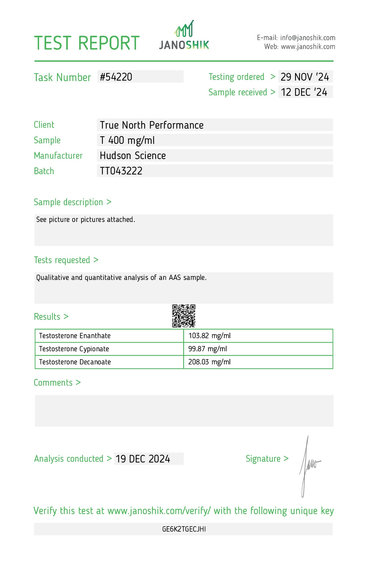 TESTOSTERONE T400 400MG/ML – Hudson Science (Certificate of Analysis, Second Image) CONTAINS E/O – Double Filtered.Little to no PIP