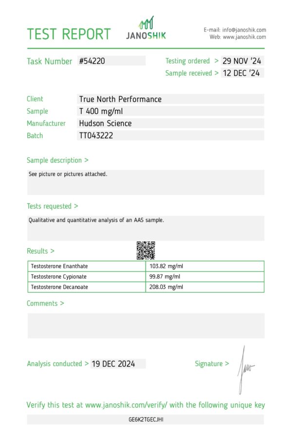 TESTOSTERONE T400 400MG/ML – (Certificate of Analysis, Second Image) CONTAINS E/O – Double Filtered.Little to no PIP
